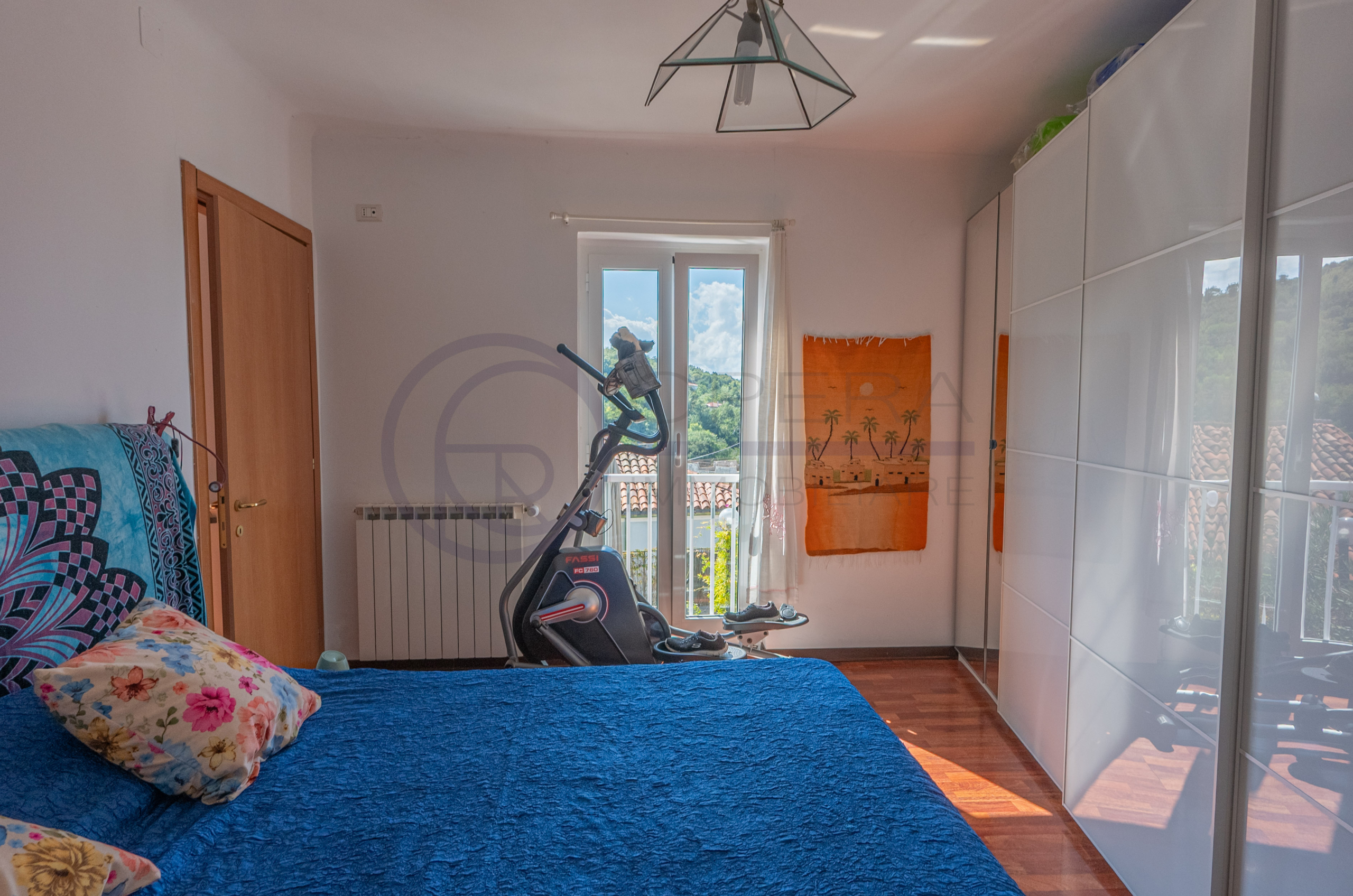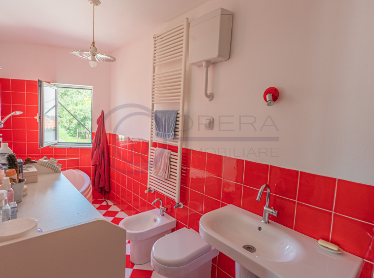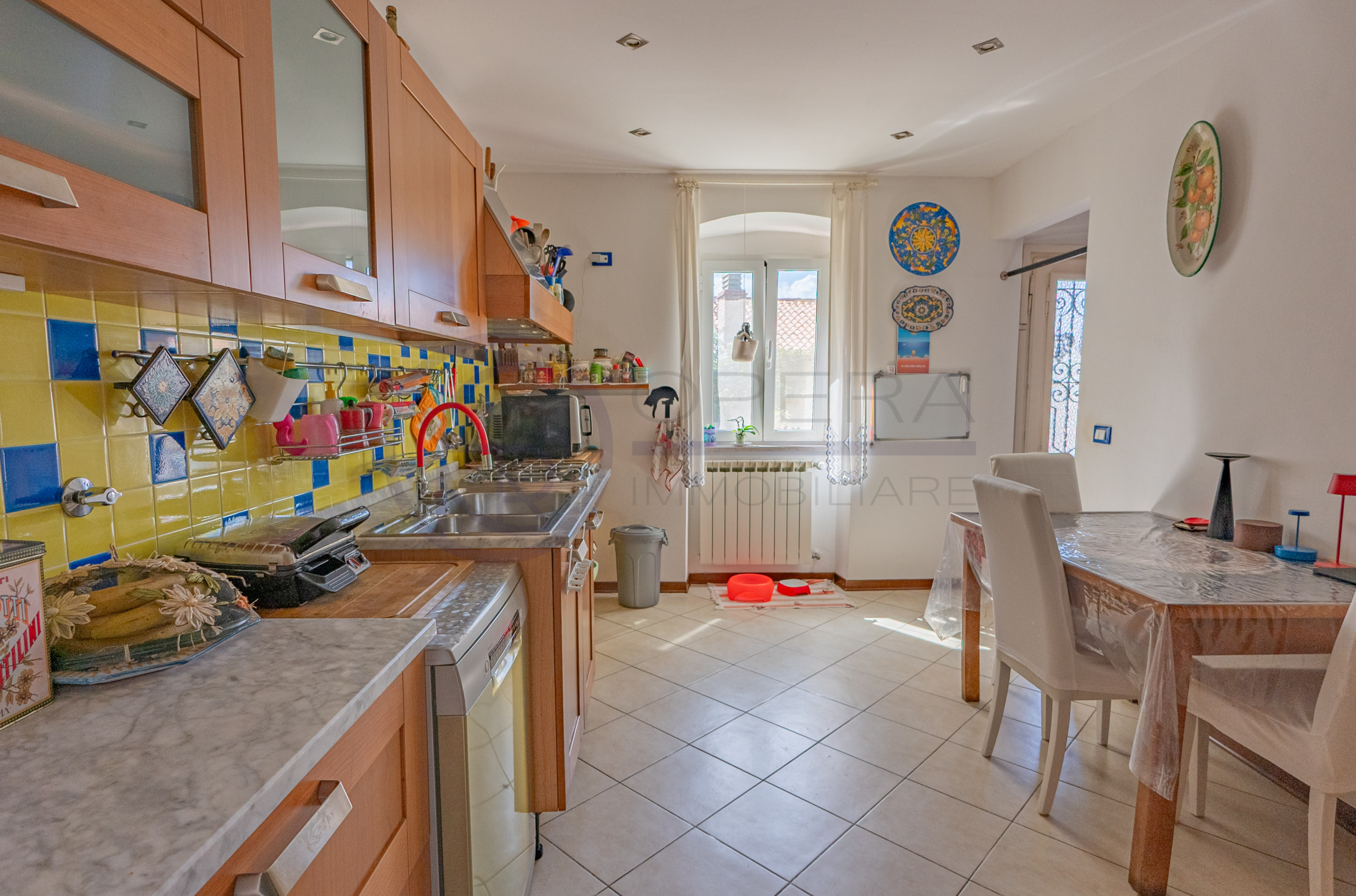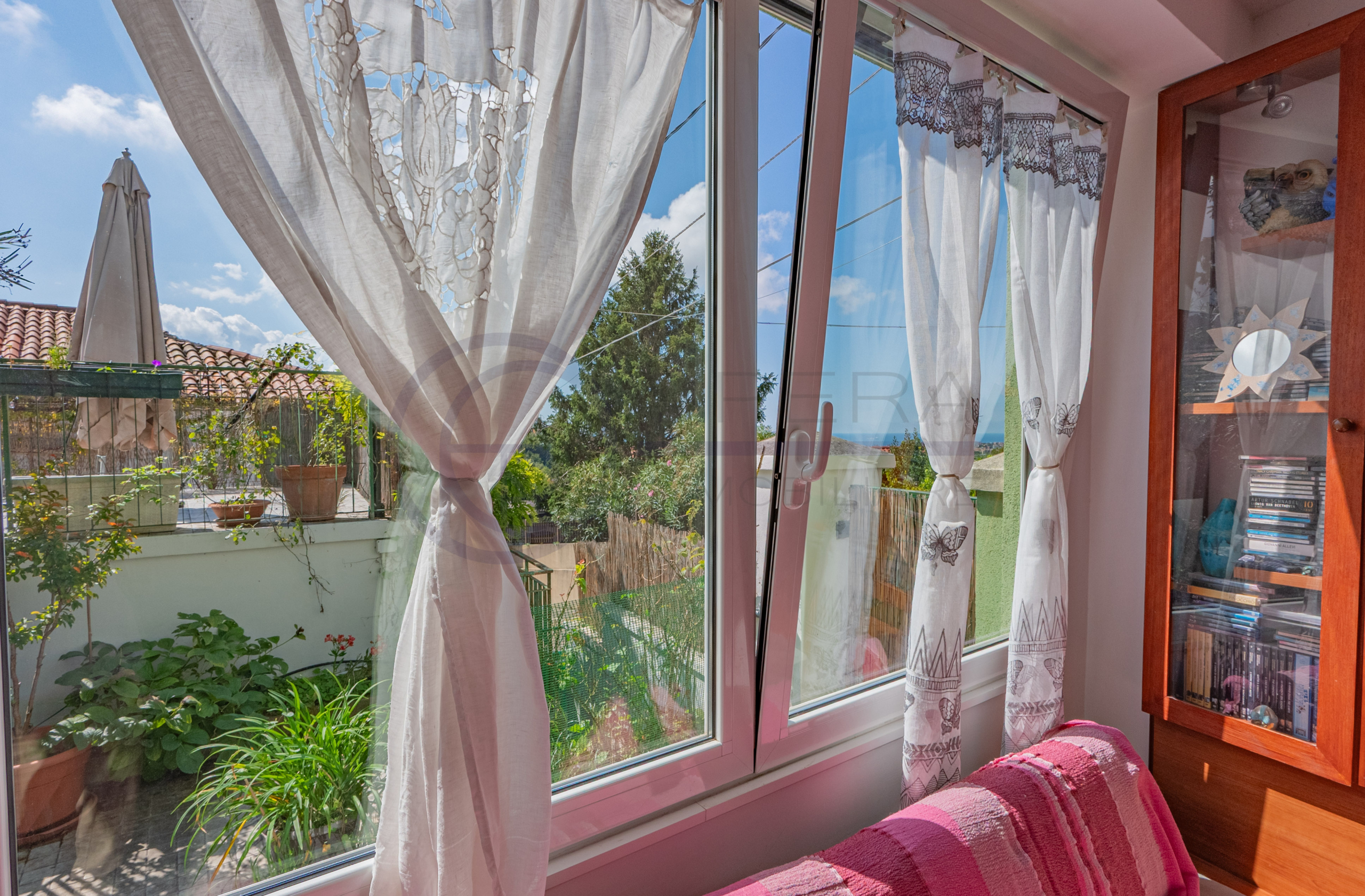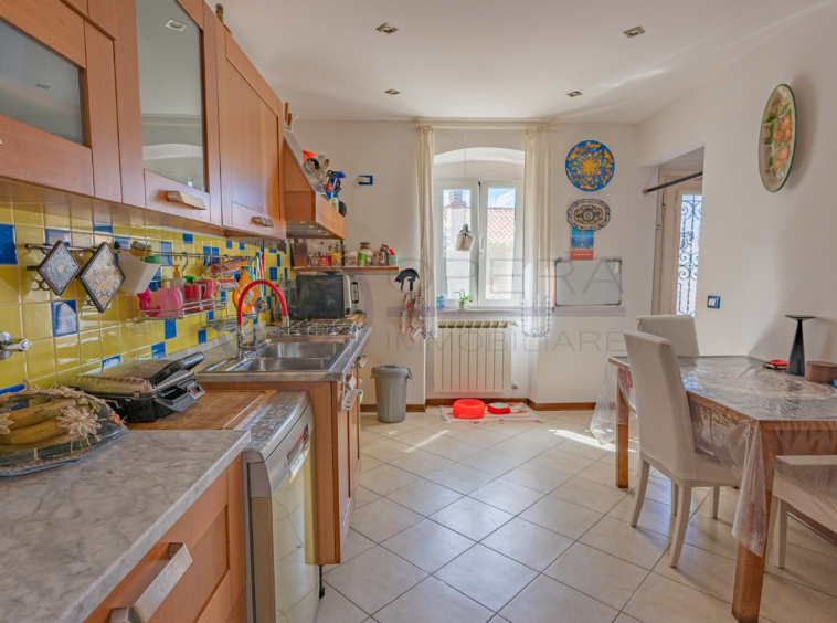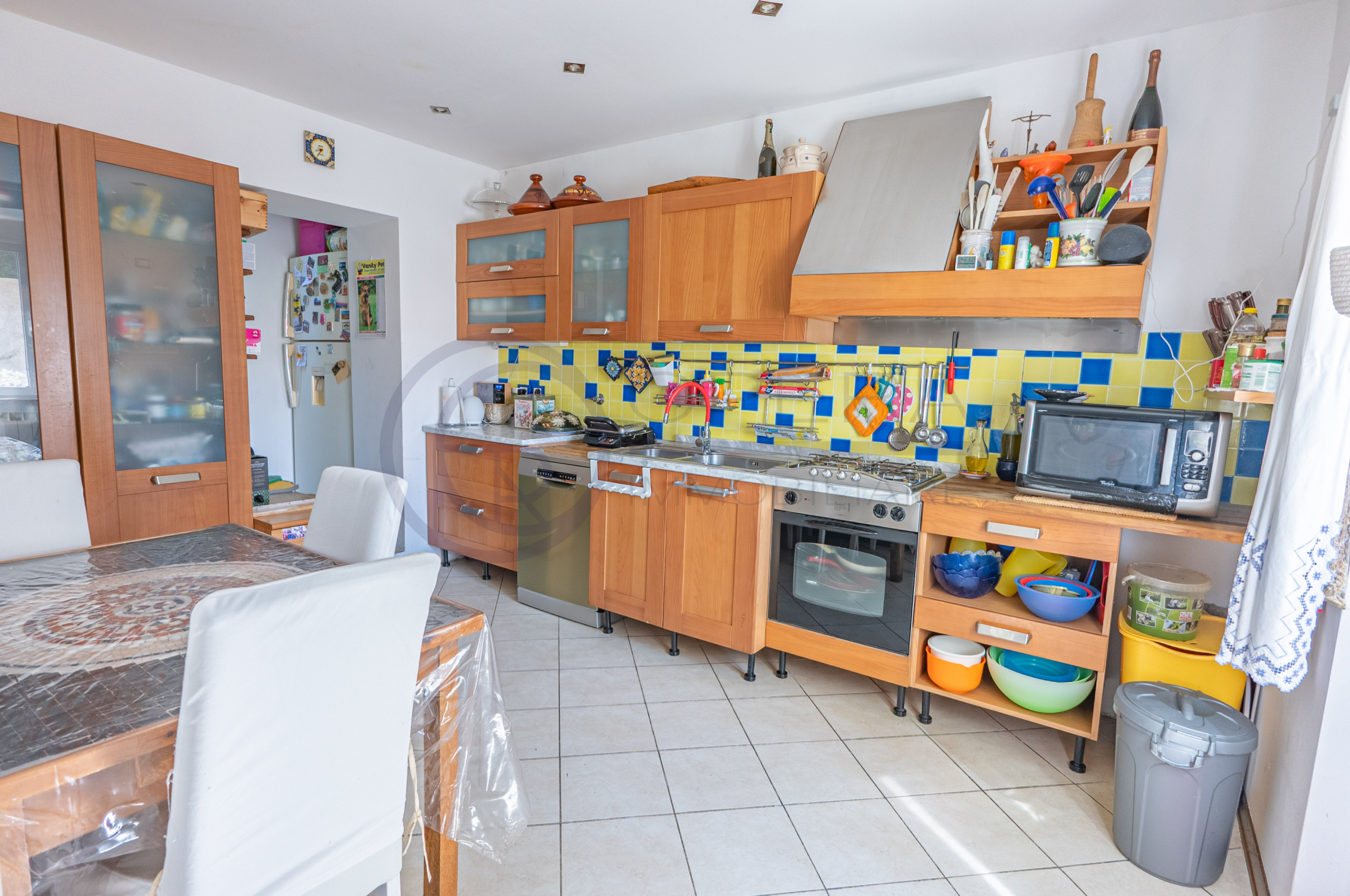 L’abitazione si sviluppa su due livelli. Al piano terra si trova una cucina abitabile spaziosa, un luminoso soggiorno con ampie finestre e una bella stufa a pellet, oltre a un bagno completo finestrato con box doccia. Al primo piano, una prima stanza adibita a studio, con accesso al terrazzo abitabile da cui si gode una piacevole vista mare, un ampio bagno finestrato con vasca e due accoglienti camere matrimoniali.