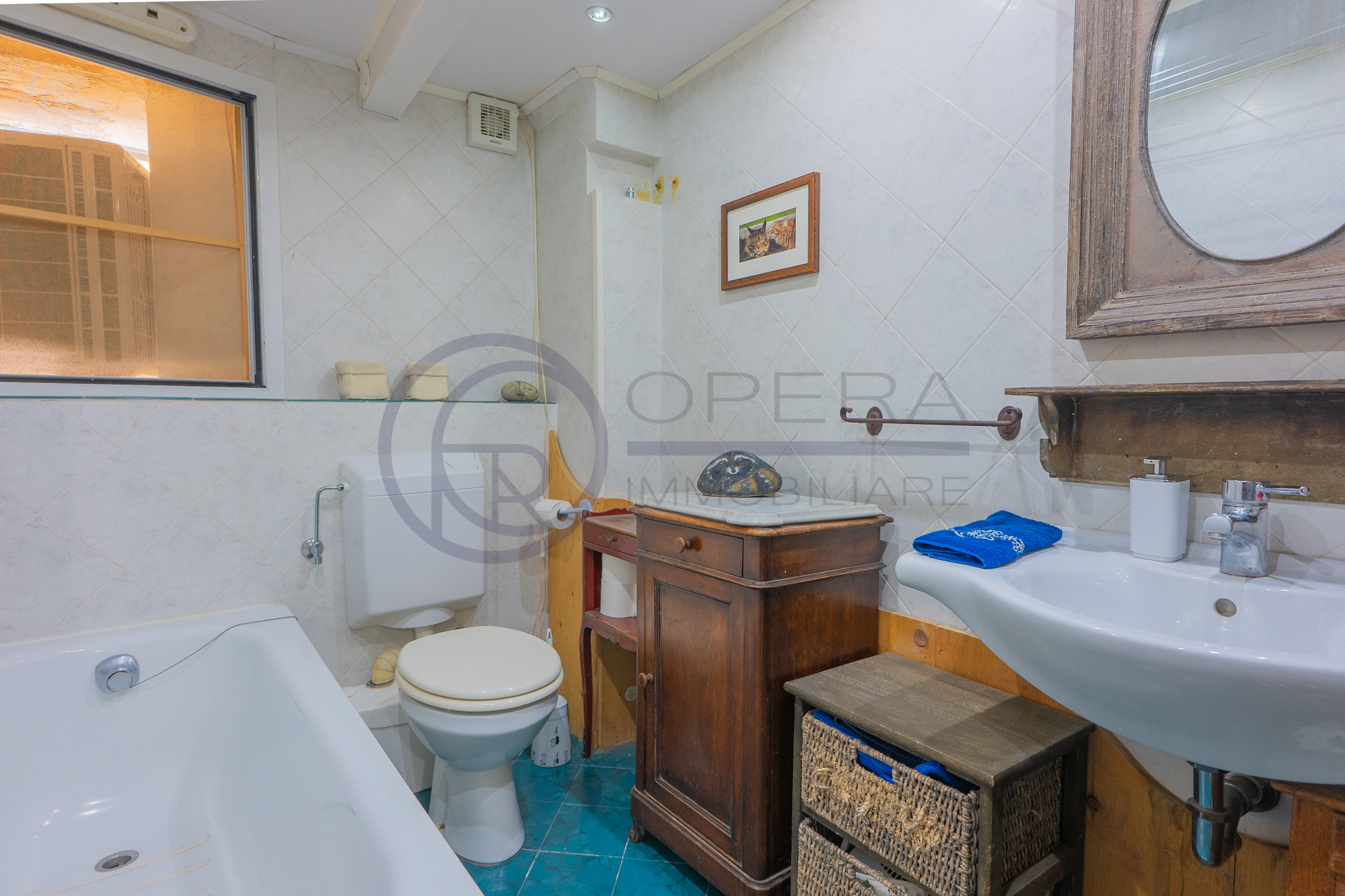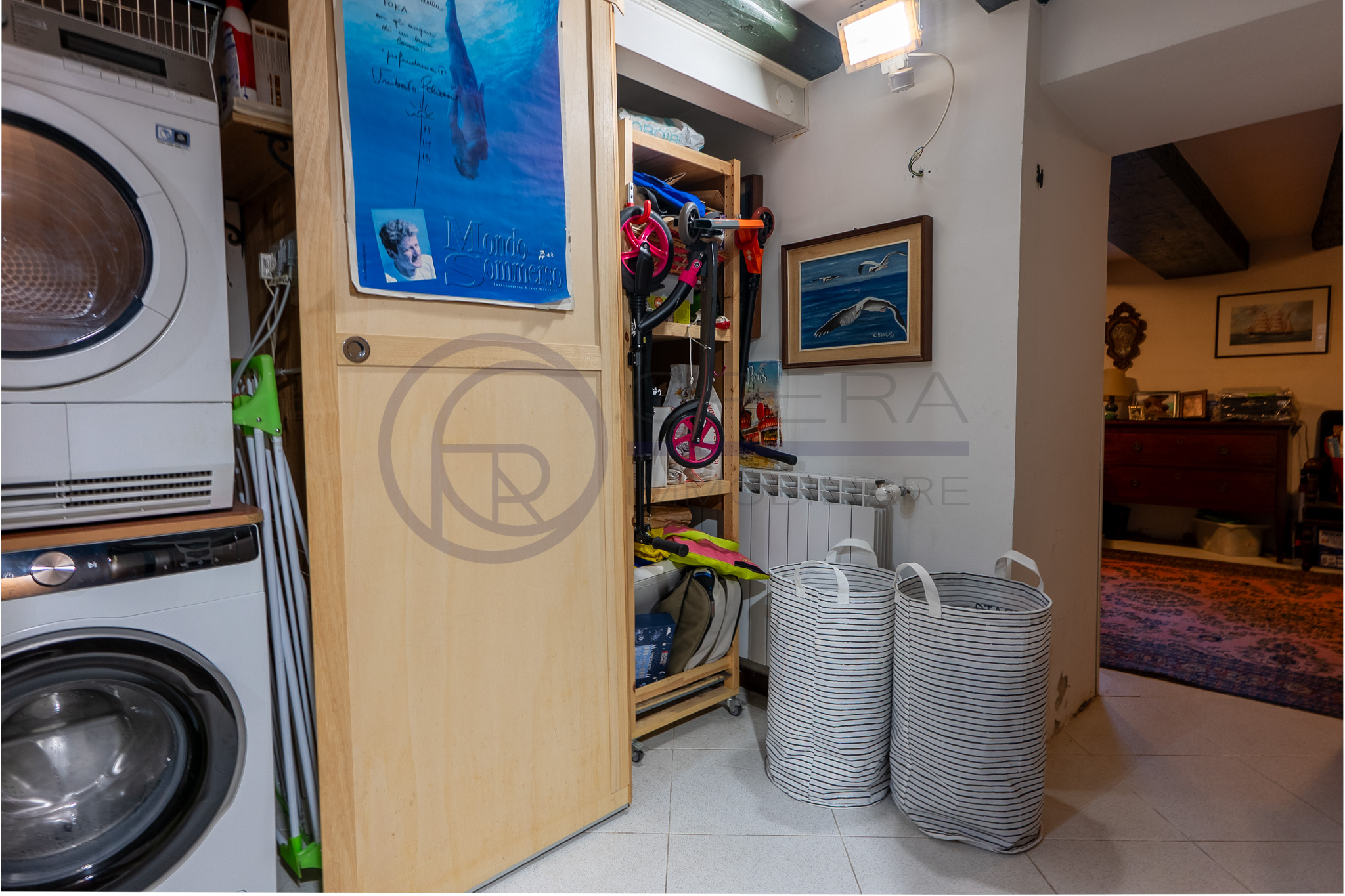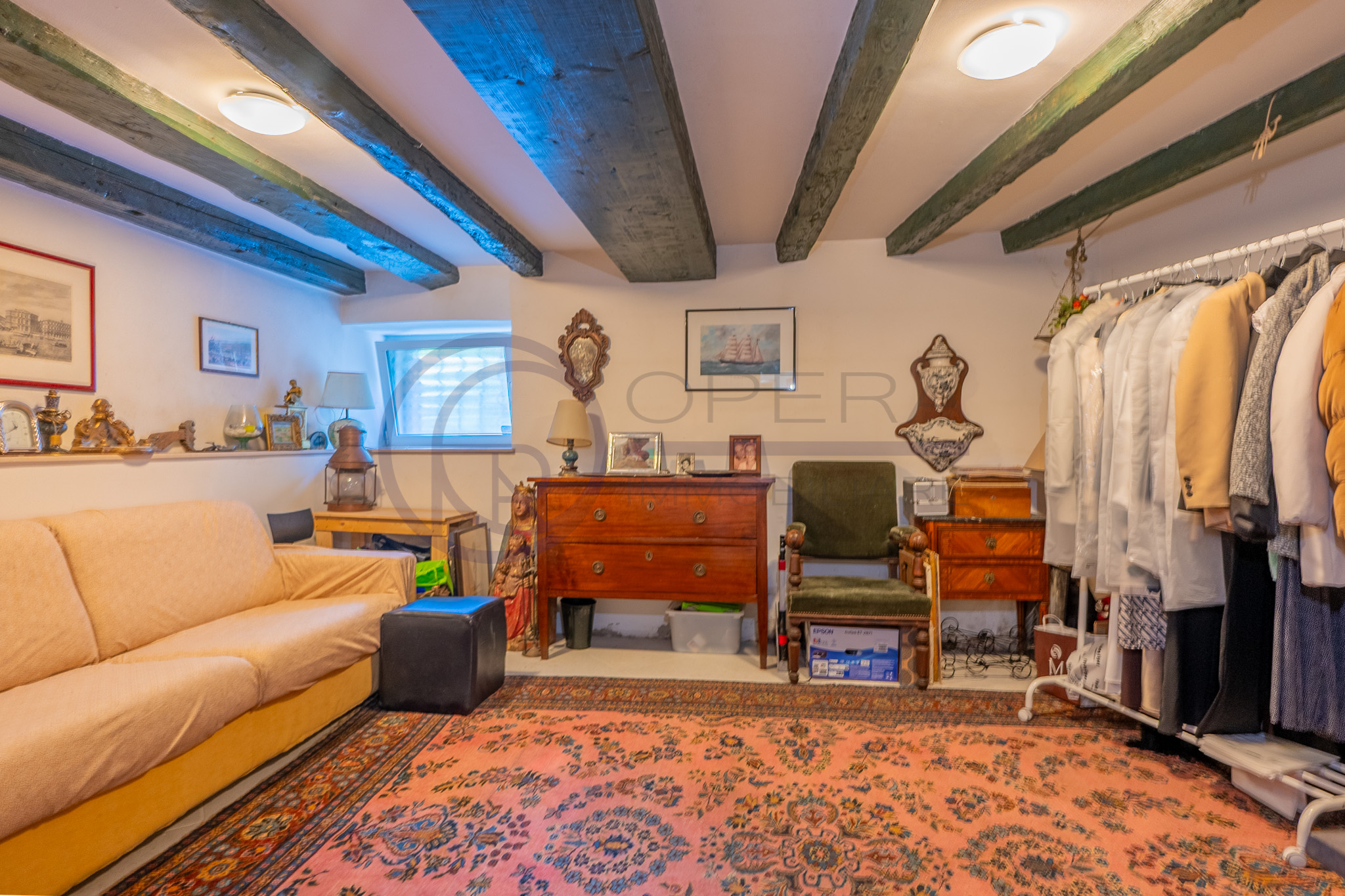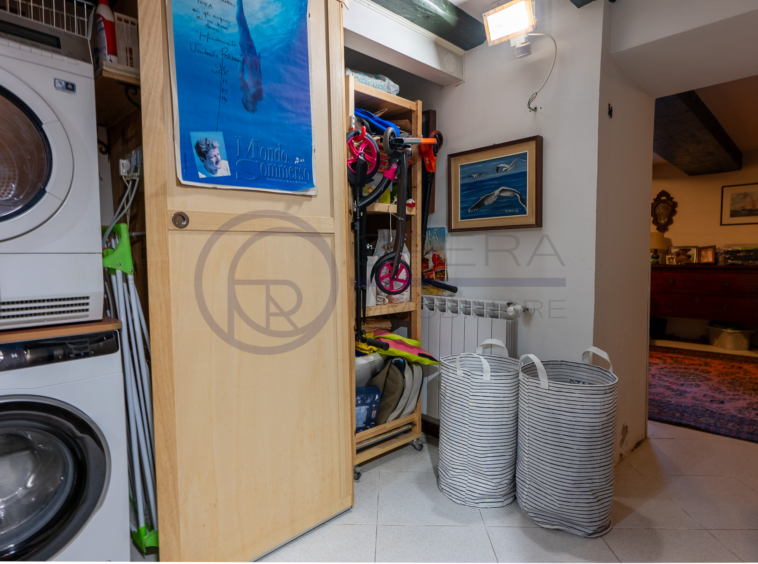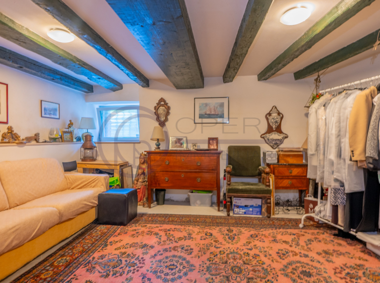 Il piano inferiore, che gode anche di un ingresso indipendente, è collegato tramite una scala a chiocciola in ferro, ed è composto da una zona attualmente adibita a taverna con travi a vista, bagno finestrato con vasca, zona lavanderia e ripostiglio/dispensa.