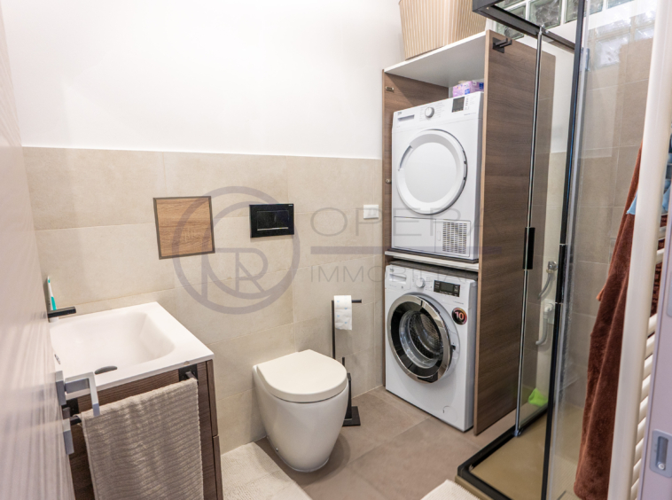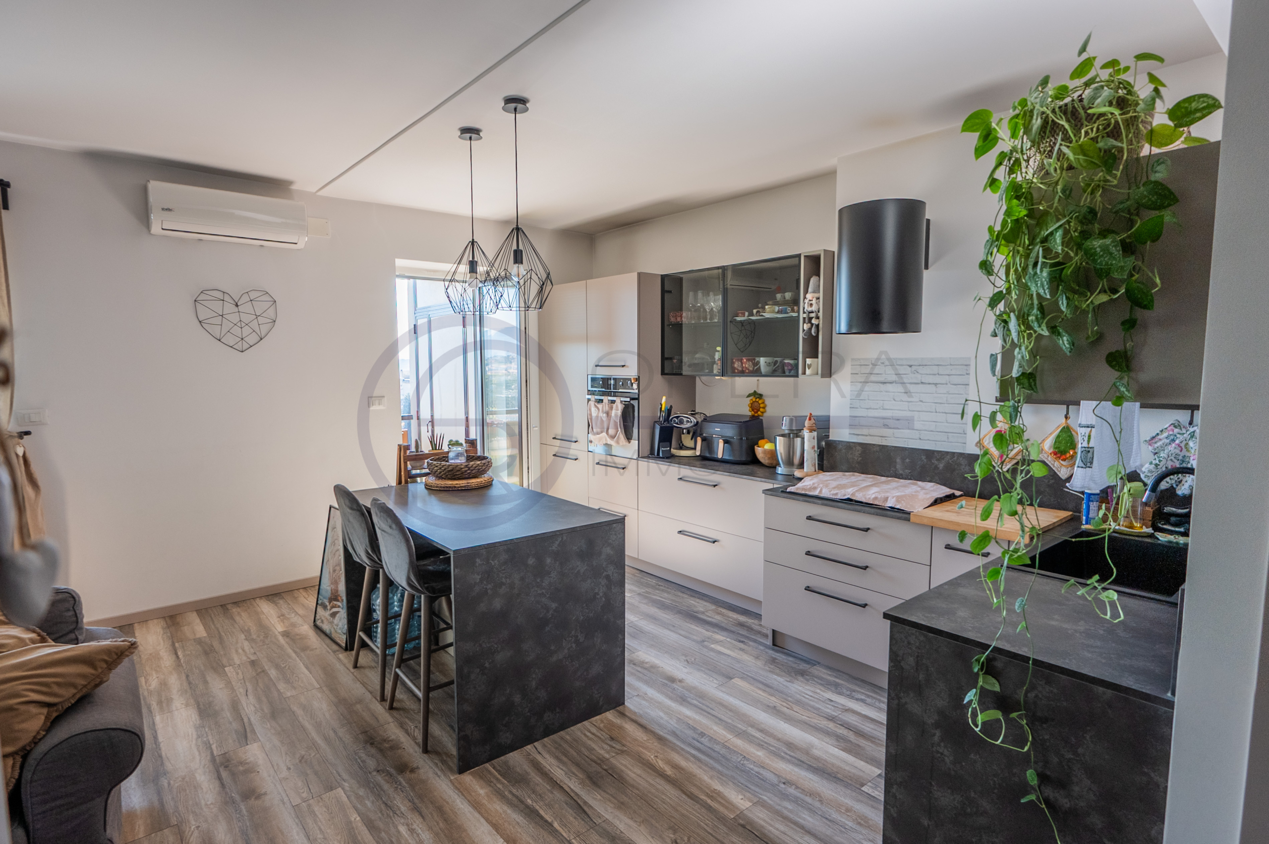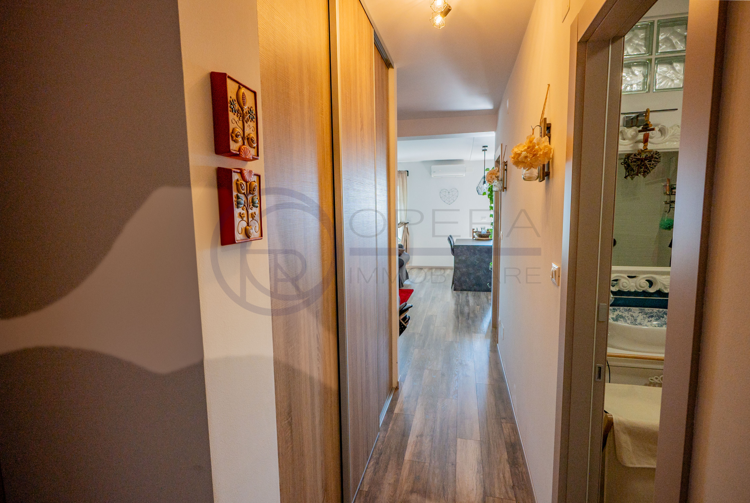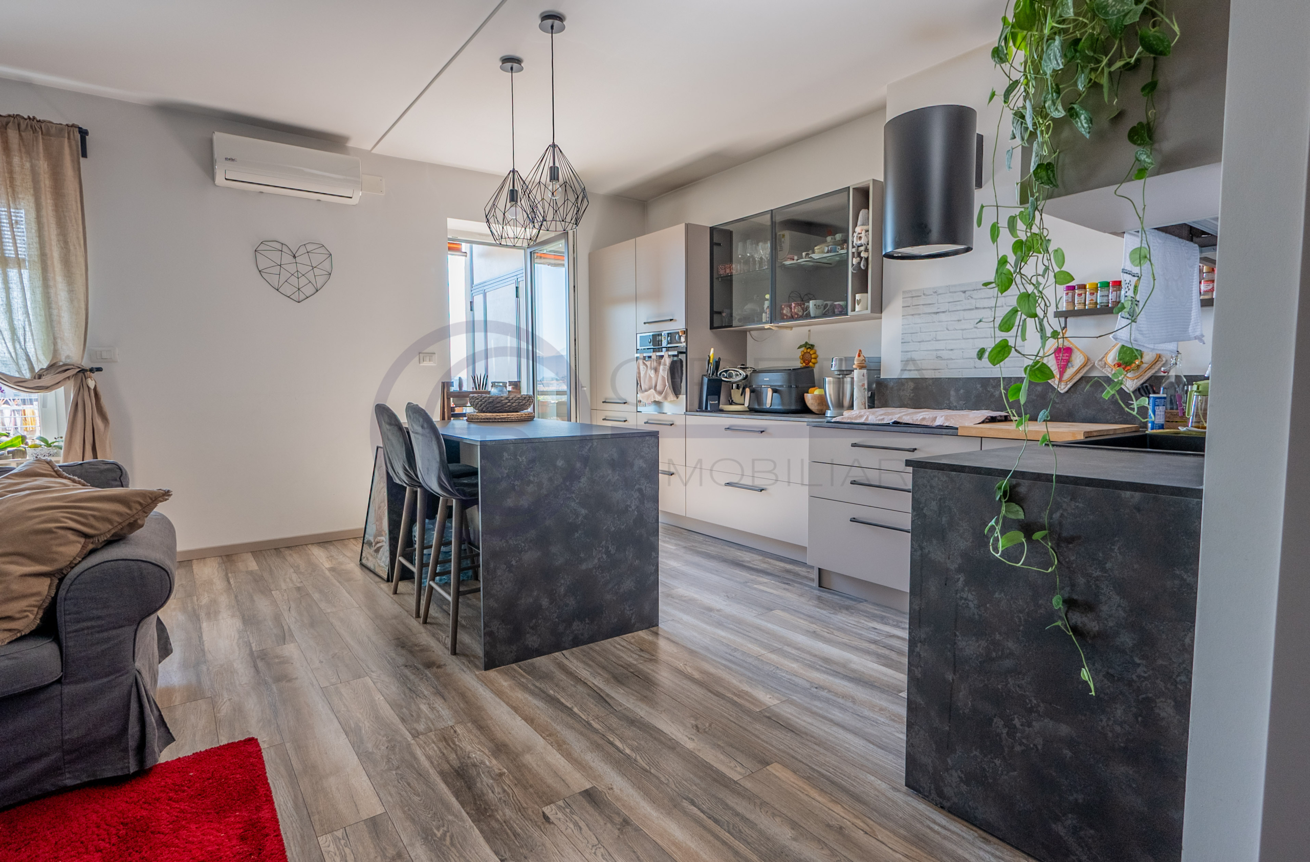 L’appartamento si apre su un accogliente ingresso che conduce all’ampio soggiorno con cucina a vista, uno spazio moderno e conviviale con accesso diretto al terrazzo abitabile. La zona notte comprende una spaziosa camera matrimoniale, una stanza singola perfetta anche come studio o cameretta e due comodi servizi.